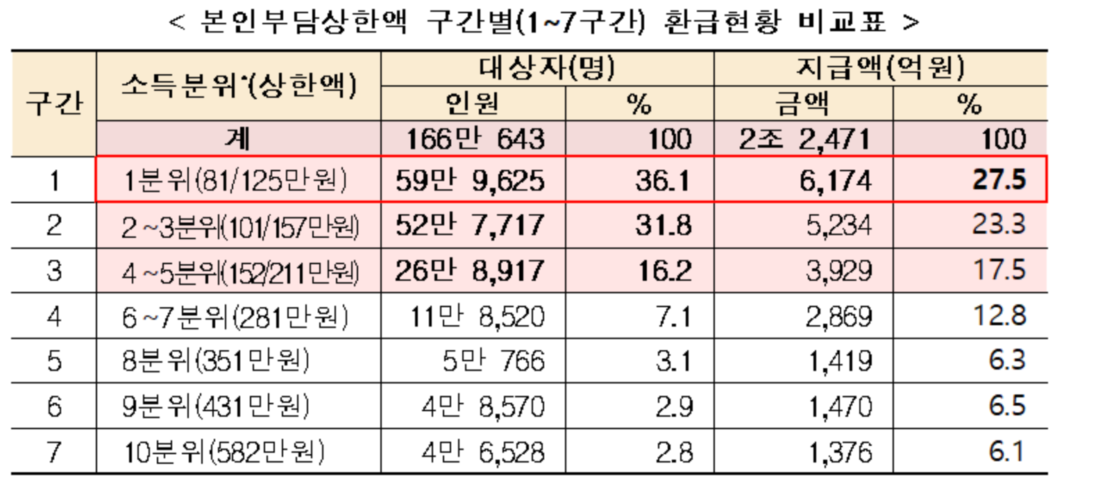 - 실제로 환급자의 약 90%가 소득 하위 50% 이하 계층이었습니다. 즉, 의료비 부담이 큰 분들에게 혜택이 집중됩니다.