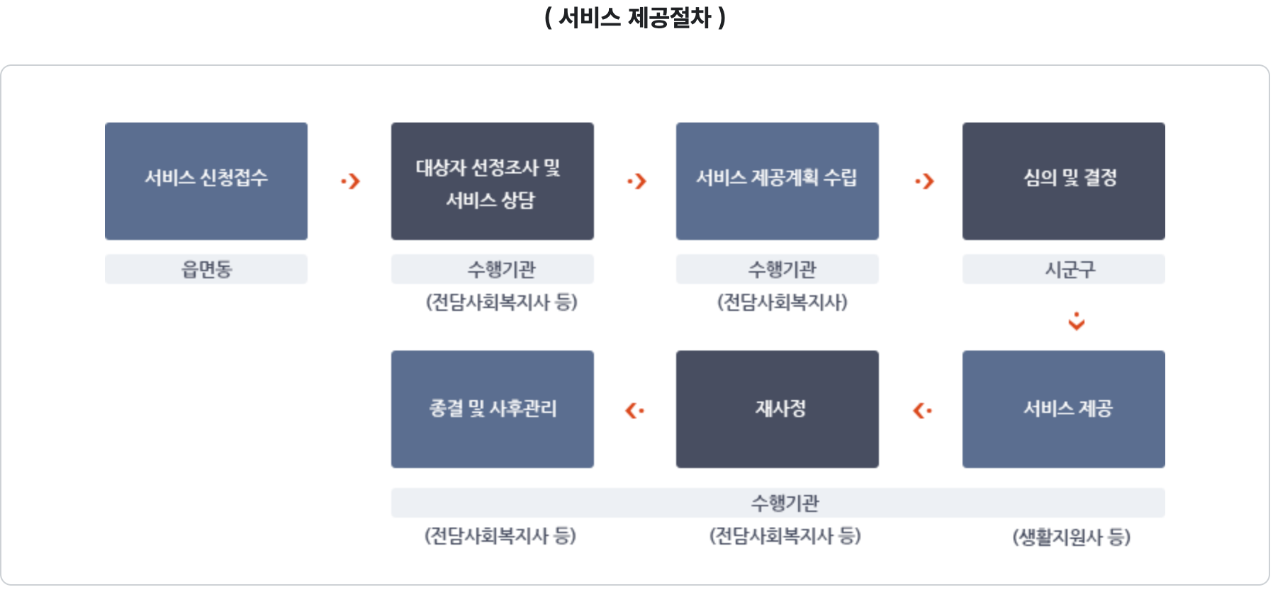 4. 절차 : 신청 → 상담 및 조사 → 대상자 선정 → 서비스 계획 수립 → 돌봄 서비스 제공 → 재평가 및 사후관리